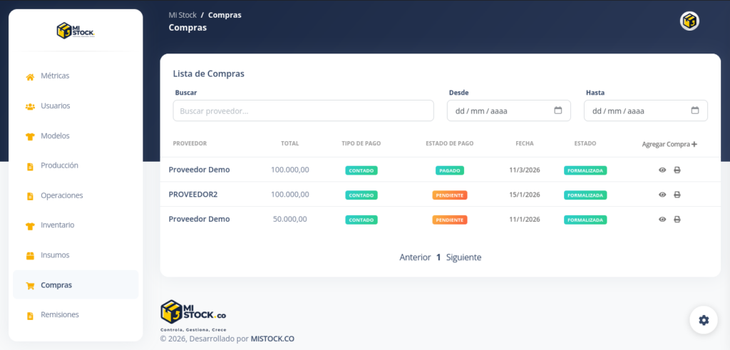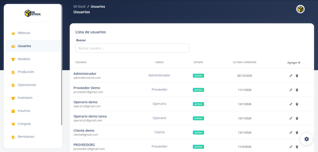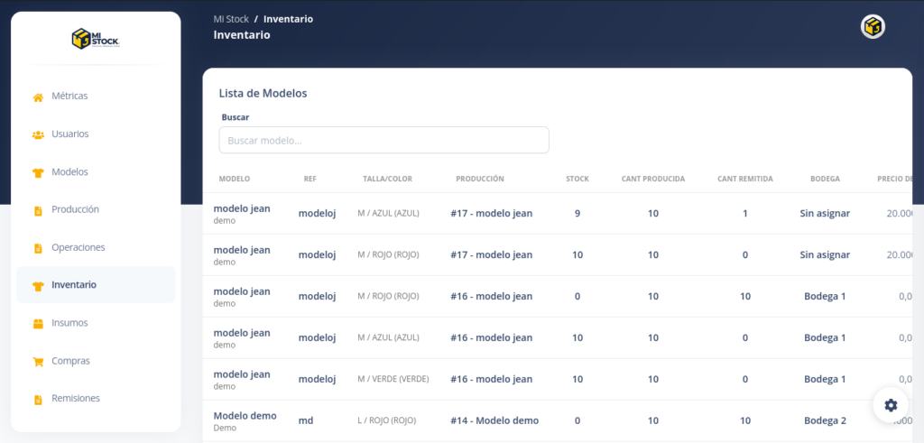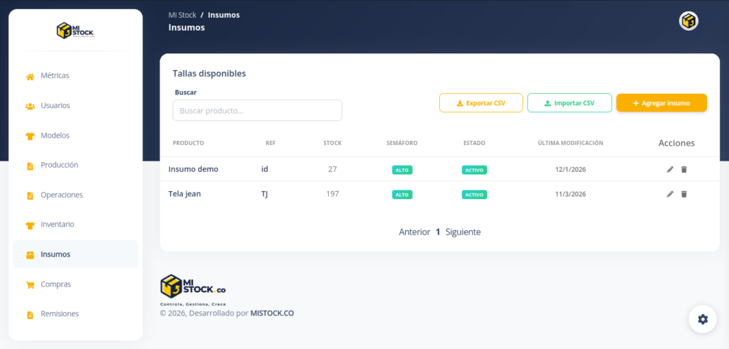 MiStock es un sistema web diseñado para gestionar procesos de producción e inventario dentro de empresas de manufactura o confección. La plataforma permite organizar modelos de productos, controlar insumos, administrar producciones y gestionar usuarios desde un solo panel de control.