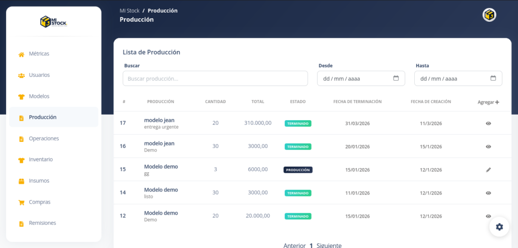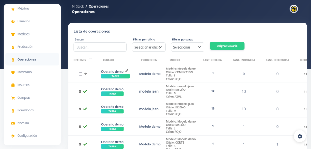 Se pueden crear producciones asociadas a modelos específicos, definir cantidades por talla y asignar operarios responsables de cada proceso.